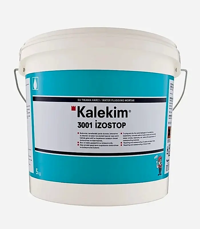Kalekim İzostop 3001 su geçirimsiz, ani priz alan, aktif su kaçaklarını önleyen, mineral dolgu ve özel çimento içeren tıkama harcıdır.