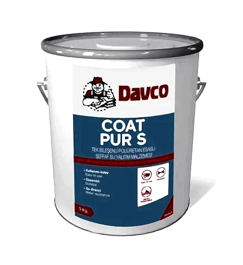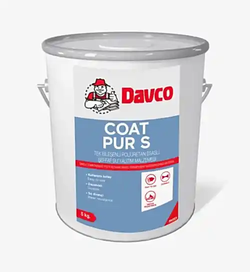 Davco Coat PUR S, yüksek oranda katı madde içeren tek komponentli, poliüretan esaslı likit bir üründür. Havadaki nemle kürlenerek oldukça dayanıklı ve elastik bir film oluşturur. Mükemmel UV direncine ve yüksek hidrofobik özelliğe sahiptir.Alifatik yapısı gereği güneş ışınlarına maruz kaldığında solmaz, sararmaz.İçeriği, UV ve diğer doğal etkenlerin yanı sıra, kimyasal, mekanik ve termal açıdan malzemeye mükemmel direnç gücü veren saf elastomerik, hidrofobik, alifatik poliüretan reçineye dayanmaktadır.