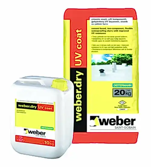 Weber DRY UV COAT Polimer emülsiyon modifiyeli, çimento esaslı, geliştirilmiş UV dayanımlı, hafif yaya trafiğine dayanıklı, çift komponentli,tam elastik su yalıtım harcı.